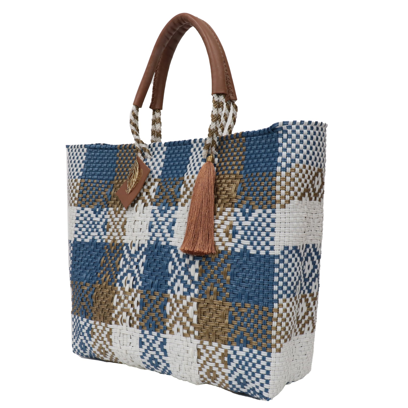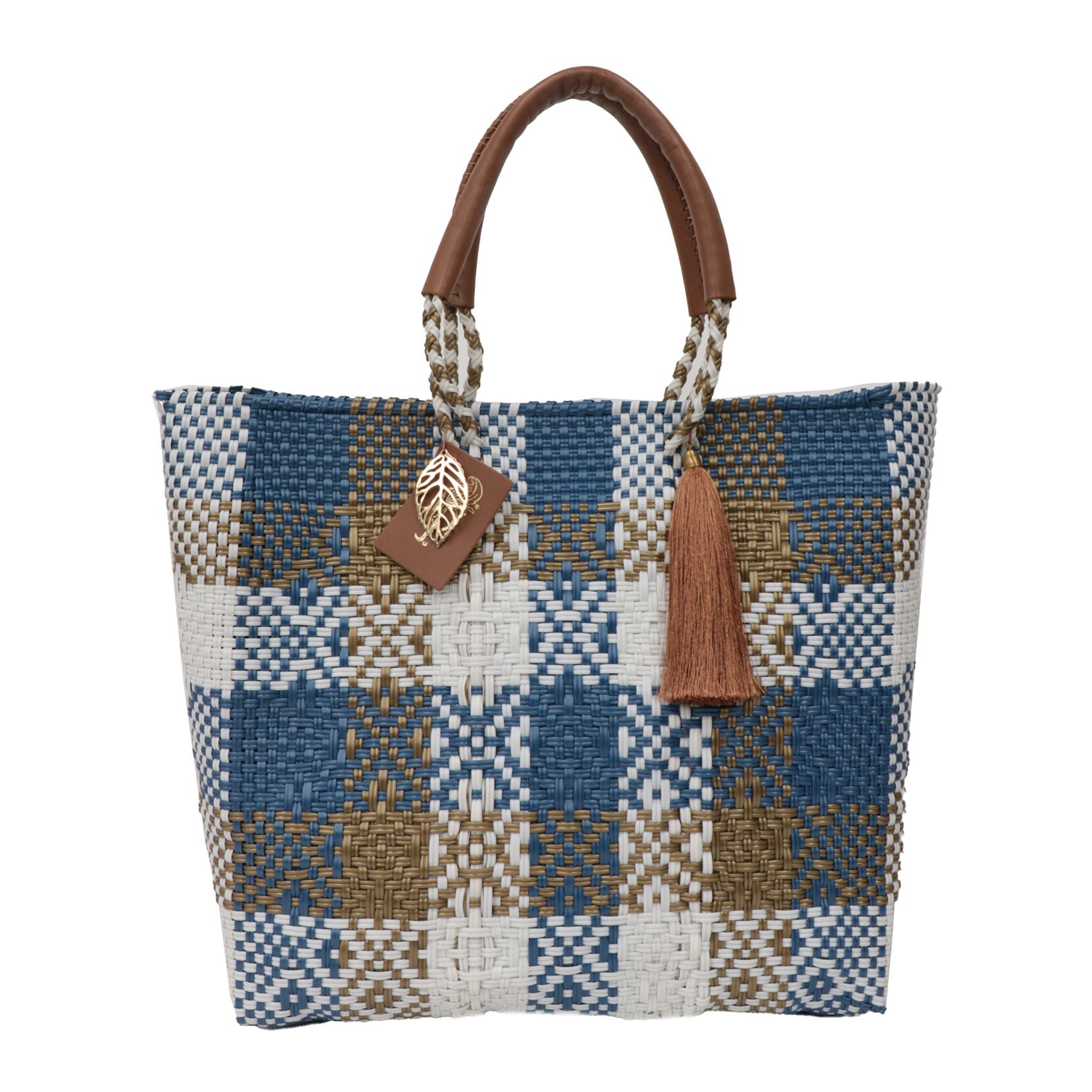 A4サイズの書類やパソコンもすっぽり入る大きさです。 クアドリとはCuadriculadoから来ています。スペイン語で「格子」という意味です。フロール(Flor)は「花」の意味です。白、ゴールド、ブルーグレーを組み合わせたクラシックな四角模様が、涼しげで落ち着いた印象です。和服や浴衣でのお出かけにもお使い頂けます。