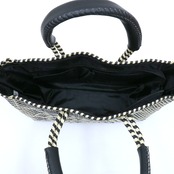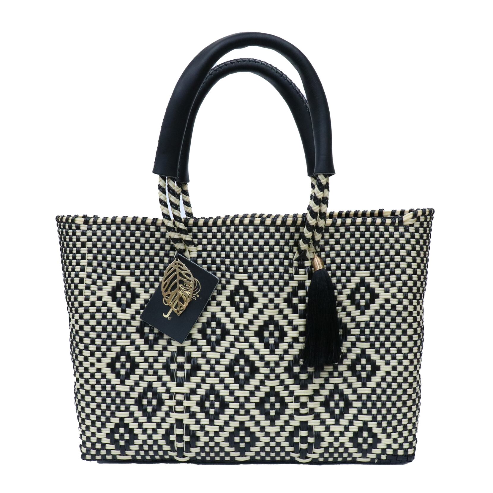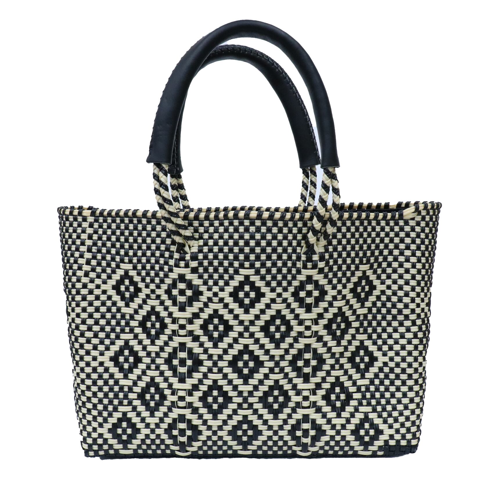 フリーダ・メディアーナのミニタイプ。A4の書類も入るので、ちょっとしたお出かけなどに便利です。スペイン語でフロール(Flor)は「花」、ロンボ(Rombo)は「ひし形」の意味です。黒い持ち手とタグが全体を引き締めています。一つ一つが一点ものに近いため、写真と実際の商品のひし形の形状や数が異なることがありますので、お買い上げの前に実際の写真をお送り致します。ご覧いただいた上で、お決め頂けましたら幸いです。