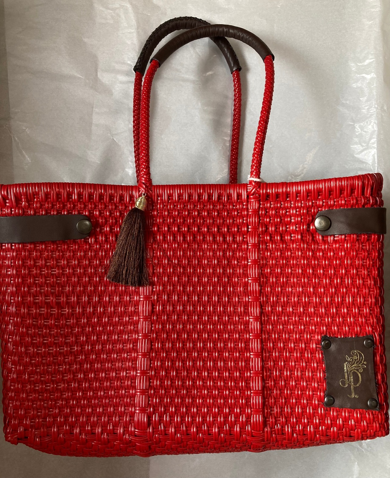 カナスタ・メディアーナの肩掛けタイプ。肩にかかる部分はメキシコ原産のチョコレートをイメージし、「赤との組み合わせでいつも元気で動けるように」との作り手の思いがこもっています。お仕事にもレジャーにもお使い頂けます。